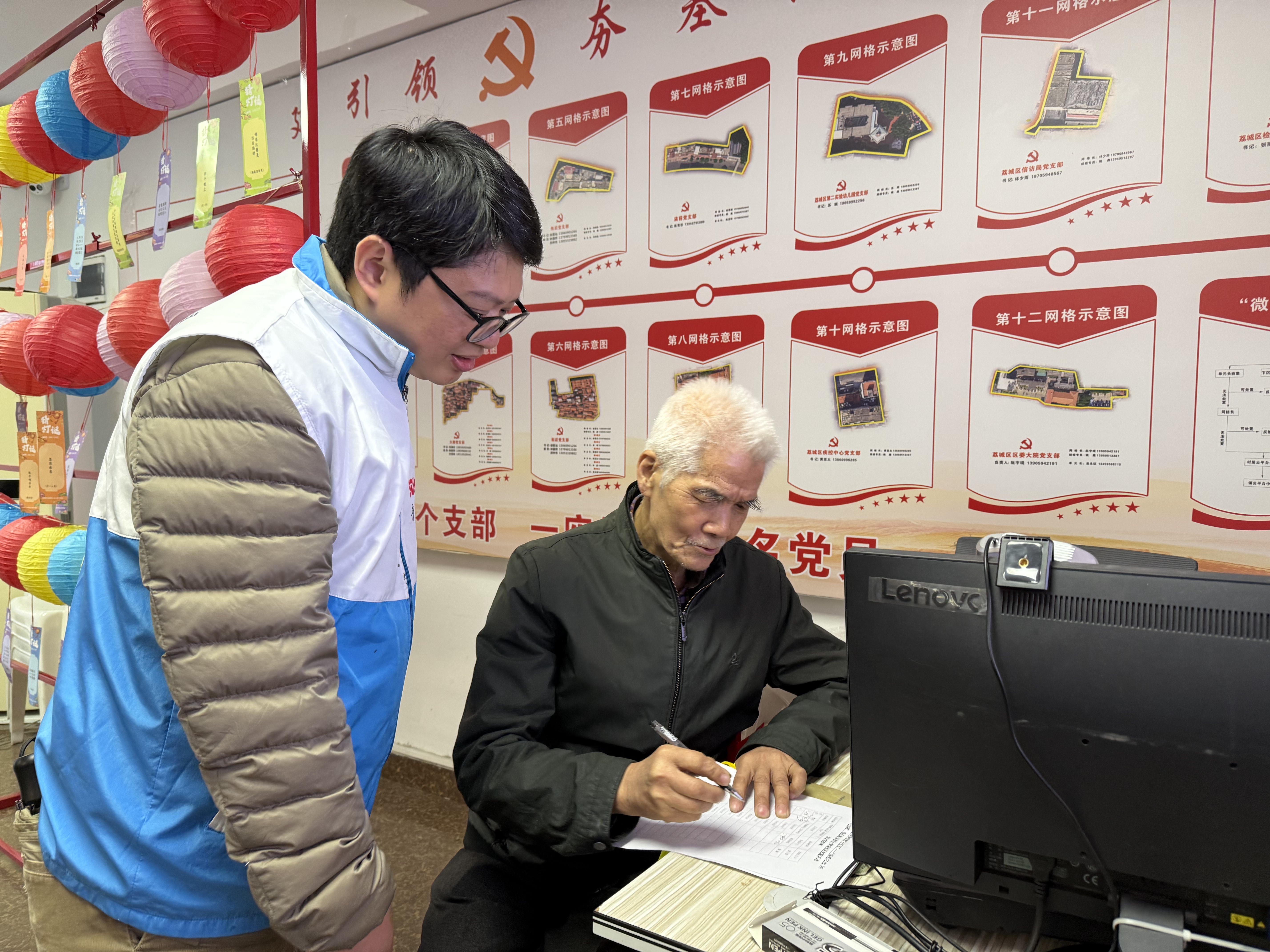在猜灯谜区,志愿者兰招娣耐心地为一位老人讲解规则:“阿姨,您看这张卡片上的谜语,猜中了可以到那边兑换小礼品。”现场居民热烈探讨谜面内涵,在智慧碰撞与欢声笑语中逐一解开谜底。