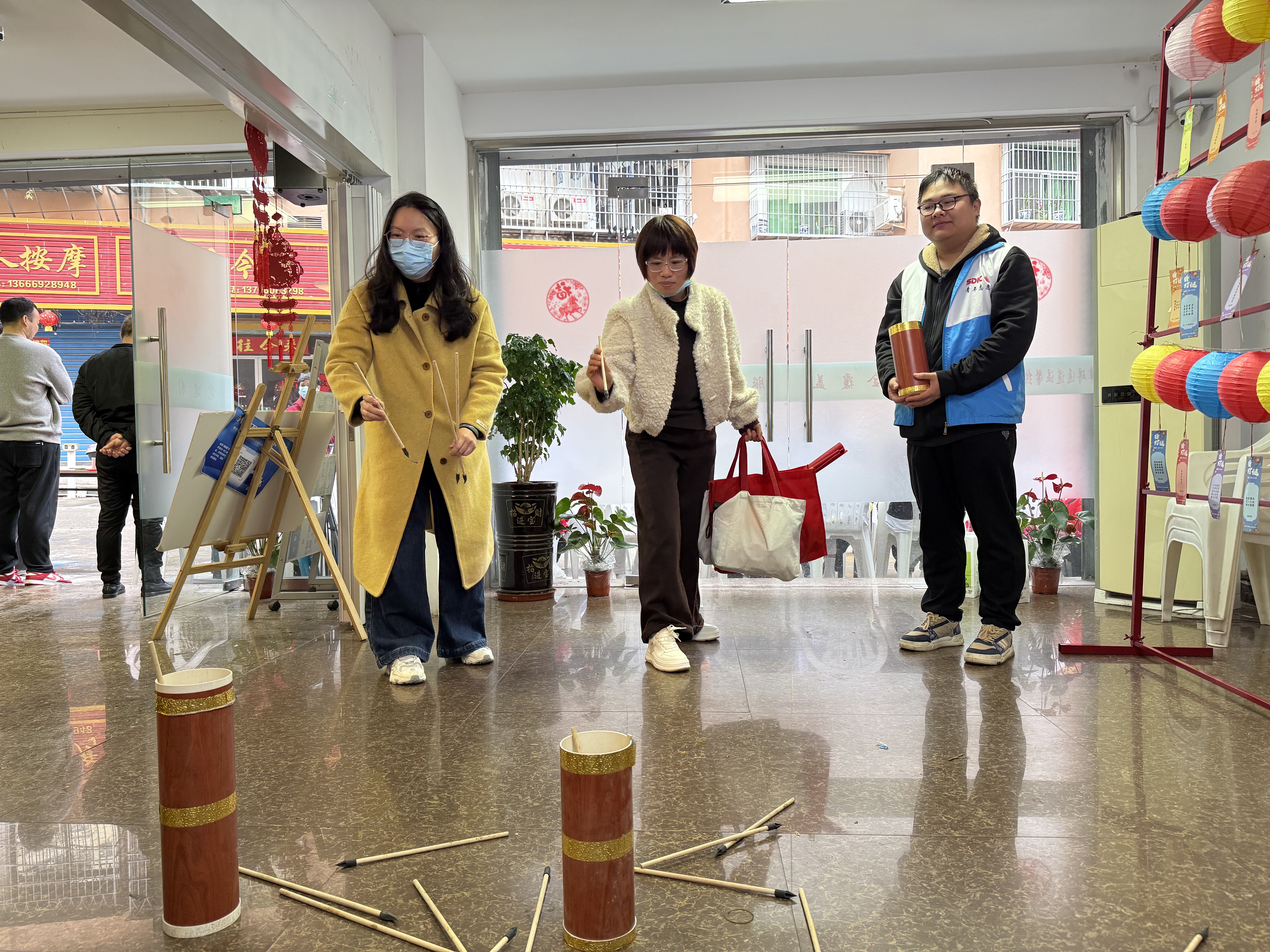 “灯笼要挂得高低错落,灯谜要贴得整齐有序。”来自运行部化验班的茫茫姐一边调整灯笼位置,一边向同伴解释布置心得。不到一小时,活动现场已焕然一新:五彩灯笼装点着室内外空间,灯谜卡片随风轻摆,投壶、击鼓等传统游戏道具整齐摆放,静待着居民的到来。