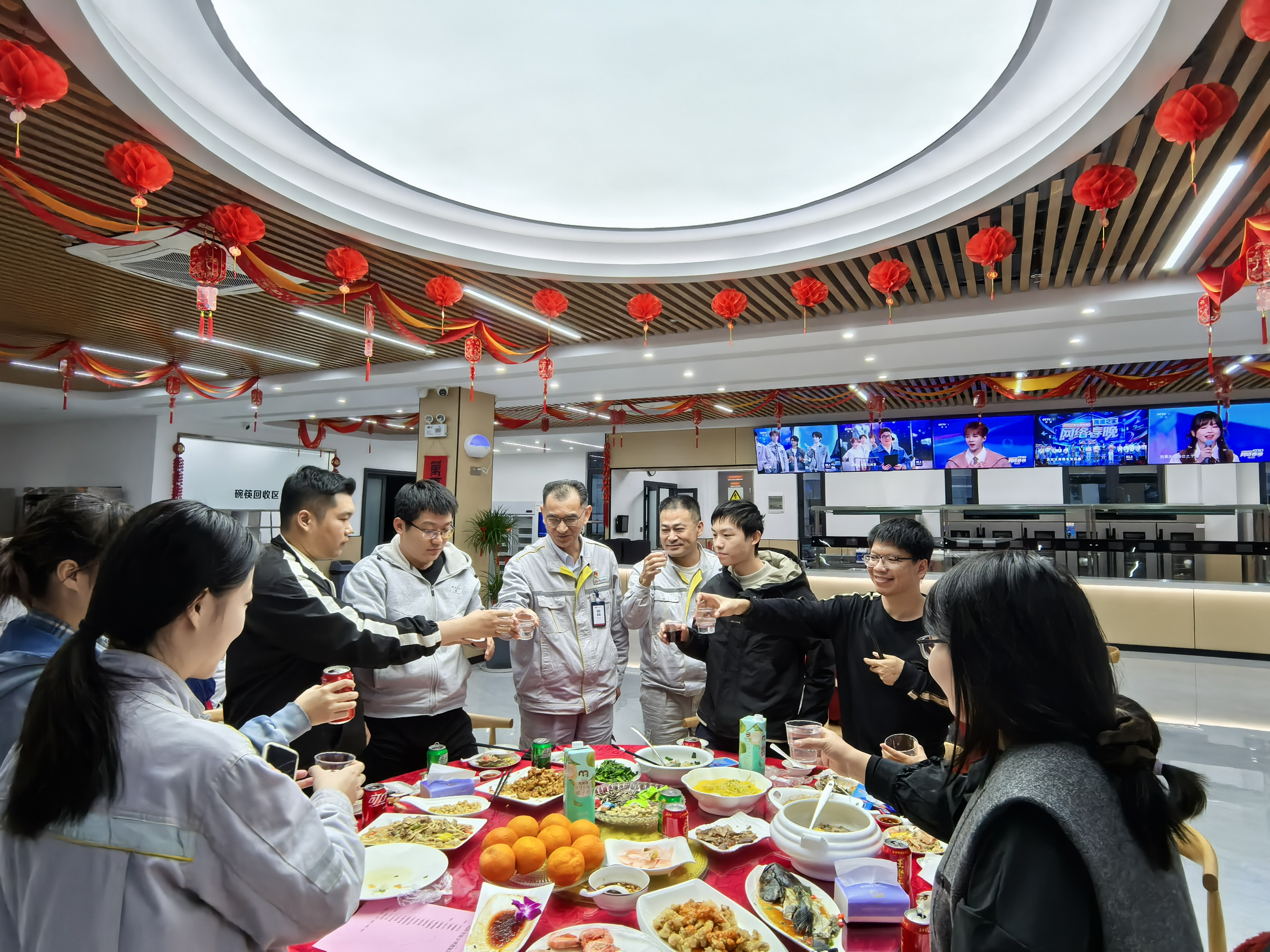 食堂里,红红灯笼高高挂起。公司为所有坚守岗位的员工及其家人准备了免费的美味年夜饭,留莆人员围坐用餐,简单却温馨。